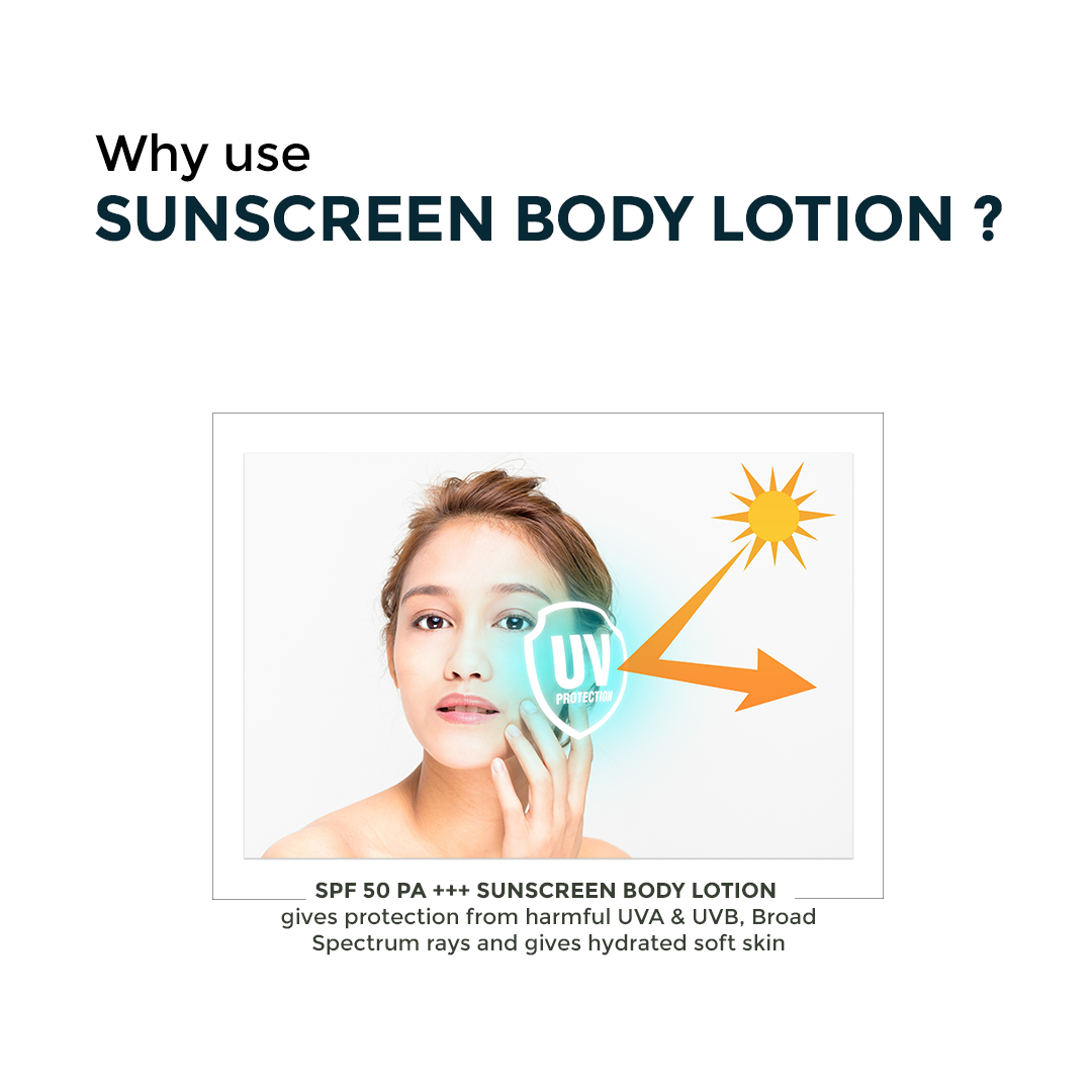 SPF Broad Spectrum UVA & UVB PROTECTION- SPF50 Sunscreen Body Lotion is the perfect filter for harmful sun rays which causes photo damage to your skin. It is non-irritant and provides broad spectrum, UVA & UVB Protection.